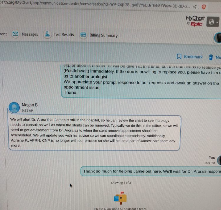 “Adraine P.” is Nurse Bitch-Ass. Urology Nurse Adraine Postlewaite. The idiot that set my husband up to die horridly, May 14th, by shirking her duties with the void trial. This was in response to my demands that this detestable bitch not be involved with anything to do with my husband while he was in that hell-spital. I find it curious that shortly after I started ranting about what she did to my beloved, starting May 17th, and again June 6th at the appointment with the primary (before admitting), she “is no longer with” their practice.