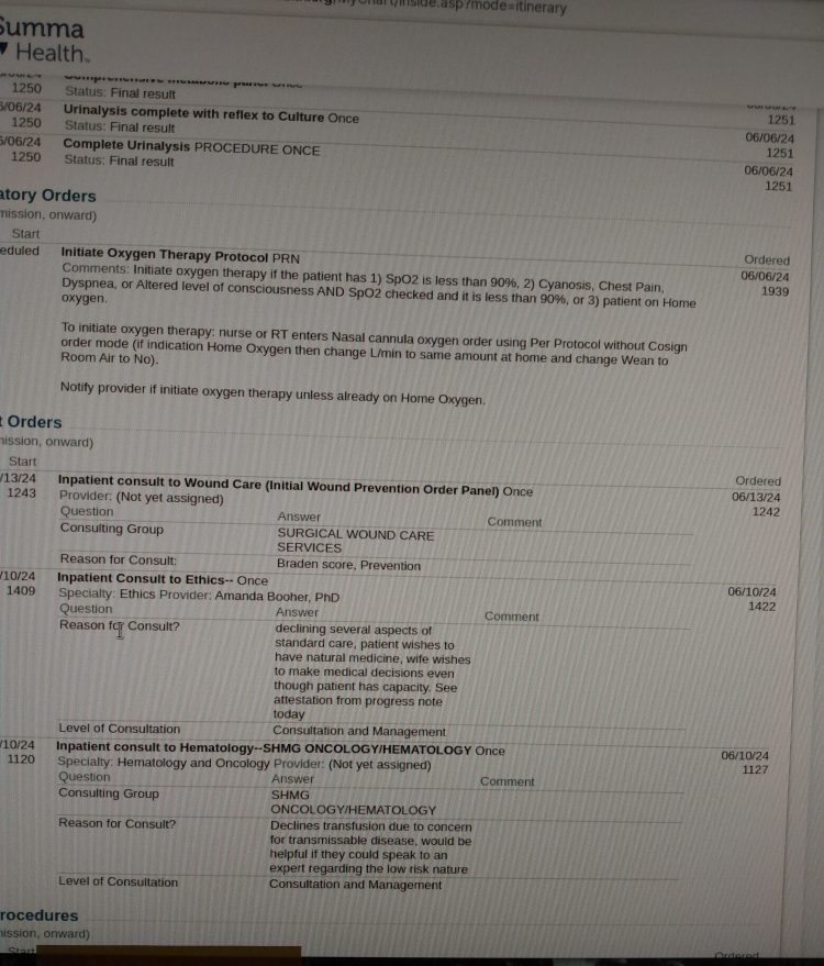 The first photo below is another part of Jamie’s chart I captured while he was in the hell-spital. From early on, like the second or third day, I saw that an “ethicist” was consulted and noted on his chart daily. (Noted half way down.) Thanx to one of the nurses, I was able to get the contact information for ethicist Amanda Booher, PhD. At some point I did speak with her and she confirmed what I assumed. The vultures, prompted by another student, were frustrated with our (Jamie and me) “declining several aspects of standard care….” and mentions that “patient wishes to have natural medicine.” There also mentions to “see attestation from progress notes today.” Each and every day, every stinking shift, their top listed “problem” was that Jamie and I supposedly did not understand the severity and scope of his issues. That is almost a direct quote. Funny. Their top stated “goal” every stinking shift, each day, was to get us to, paraphrased, see his condition and treatment from their view. Too funny.