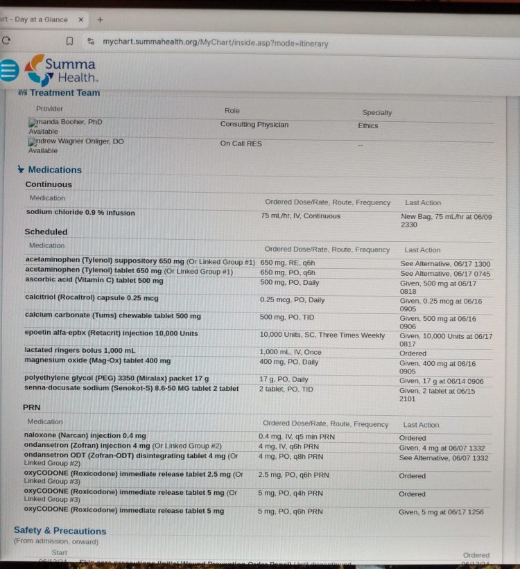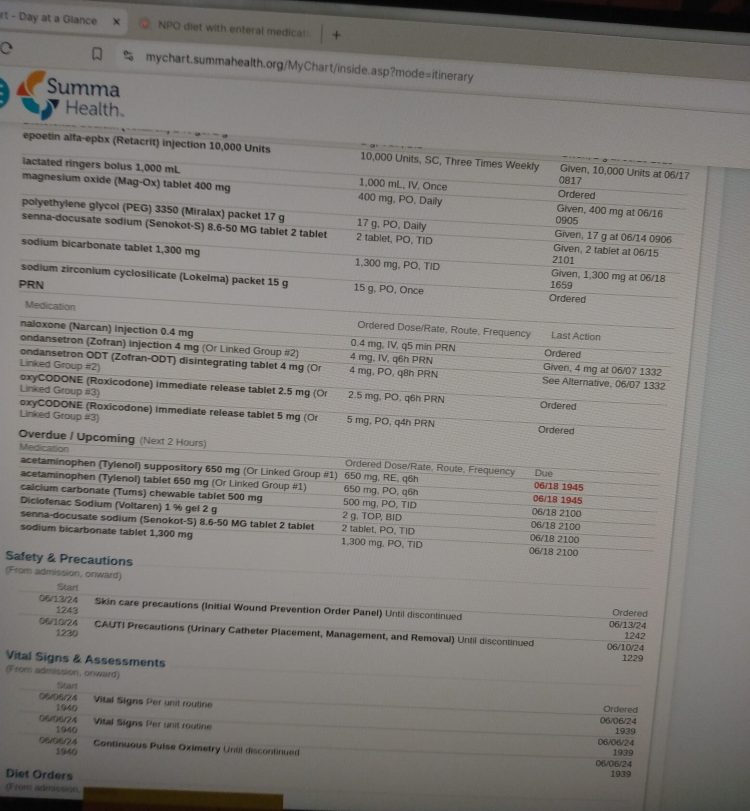 So far we covered how the Summa/Akron ER brutalized Jamie on April 25th, 2024. Then, after a couple weeks of improvement, Nurse Bitch-Ass and her sidekick in urology set him up for a brutal death at the May 14th void trial. Though they did not succeed (thanx to God alone) in killing him then (May 17th), still my husband declined to the point that we asked to have him admitted on June 6th.